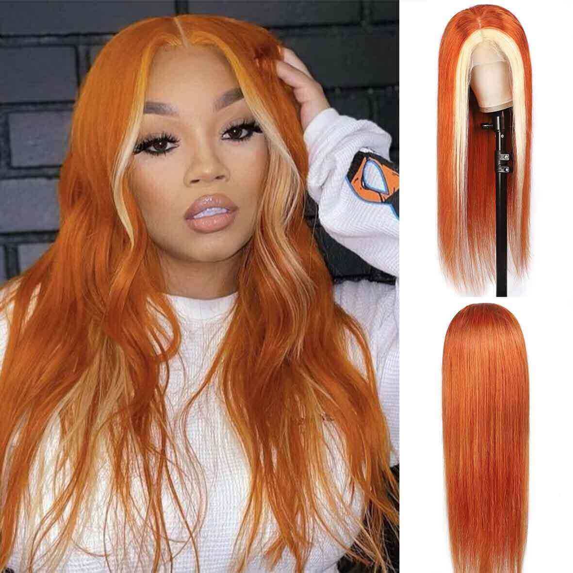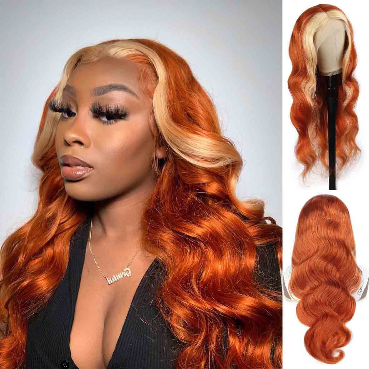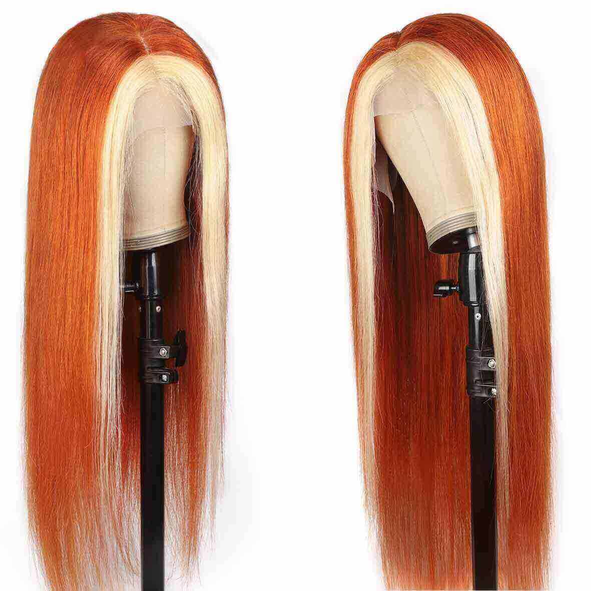 HD Lace Closure Human Hair Wig Skunk Stripe Hair Ginger Hair with Blonde Highlights